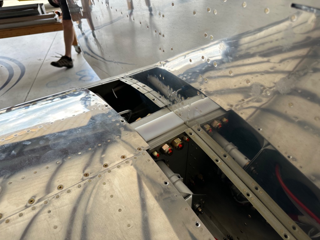 March drilled and installed wing root fairings. Added zip ties to left wing root wires. Fabricated and bonded wing root spacers